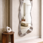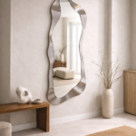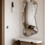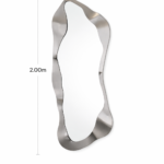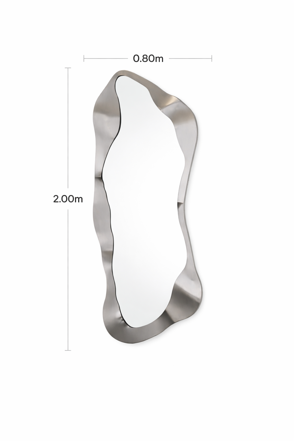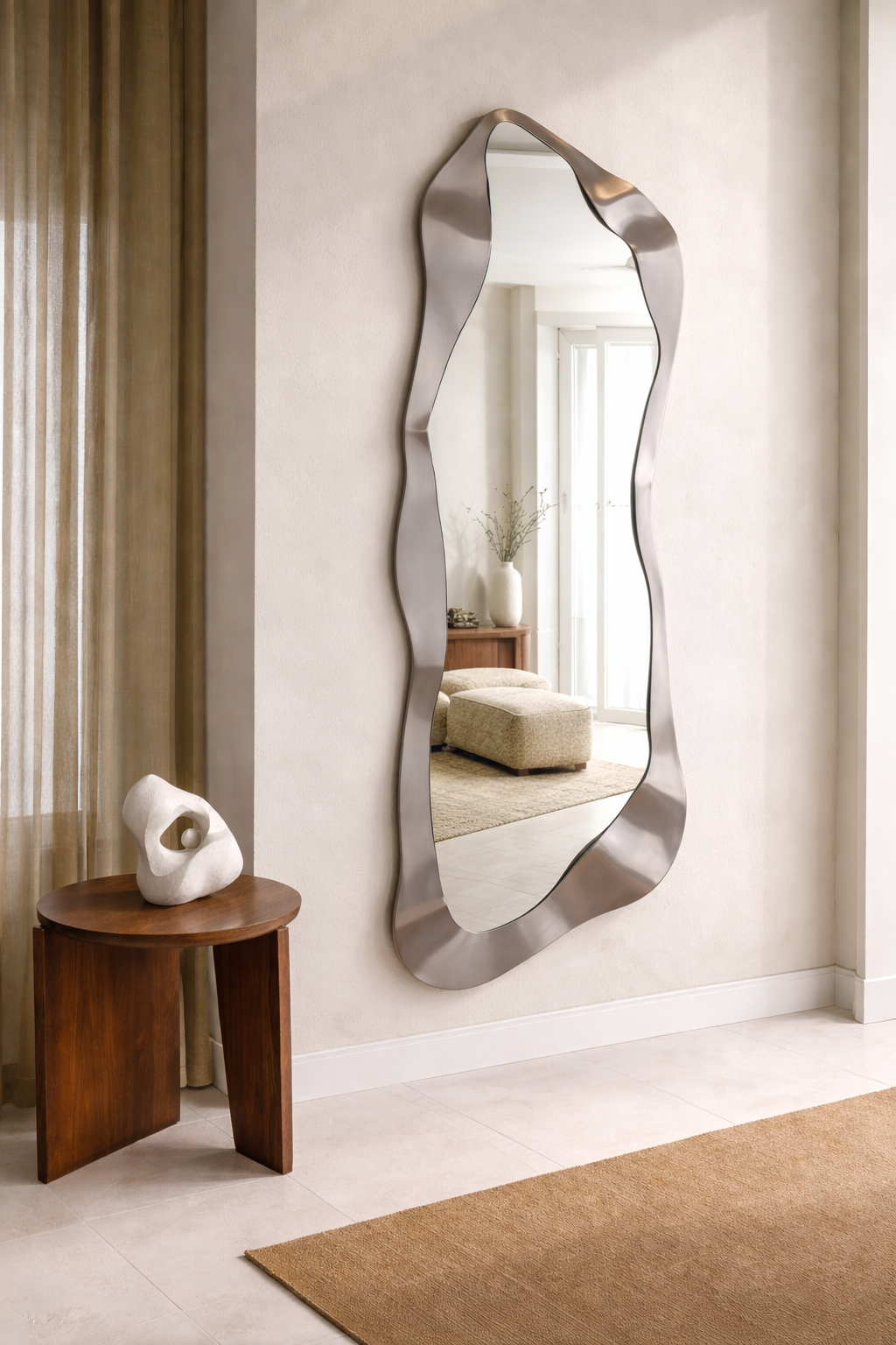 Apolo surge como una escultura de luz detenida en el tiempo: un espejo de forma libre, un marco como si hubiese sido forjado en fuego sagrado. Su silueta recuerda la huella de un astro en movimiento, un fragmento divino que se materializa para habitar los espacios más extraordinarios.