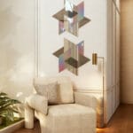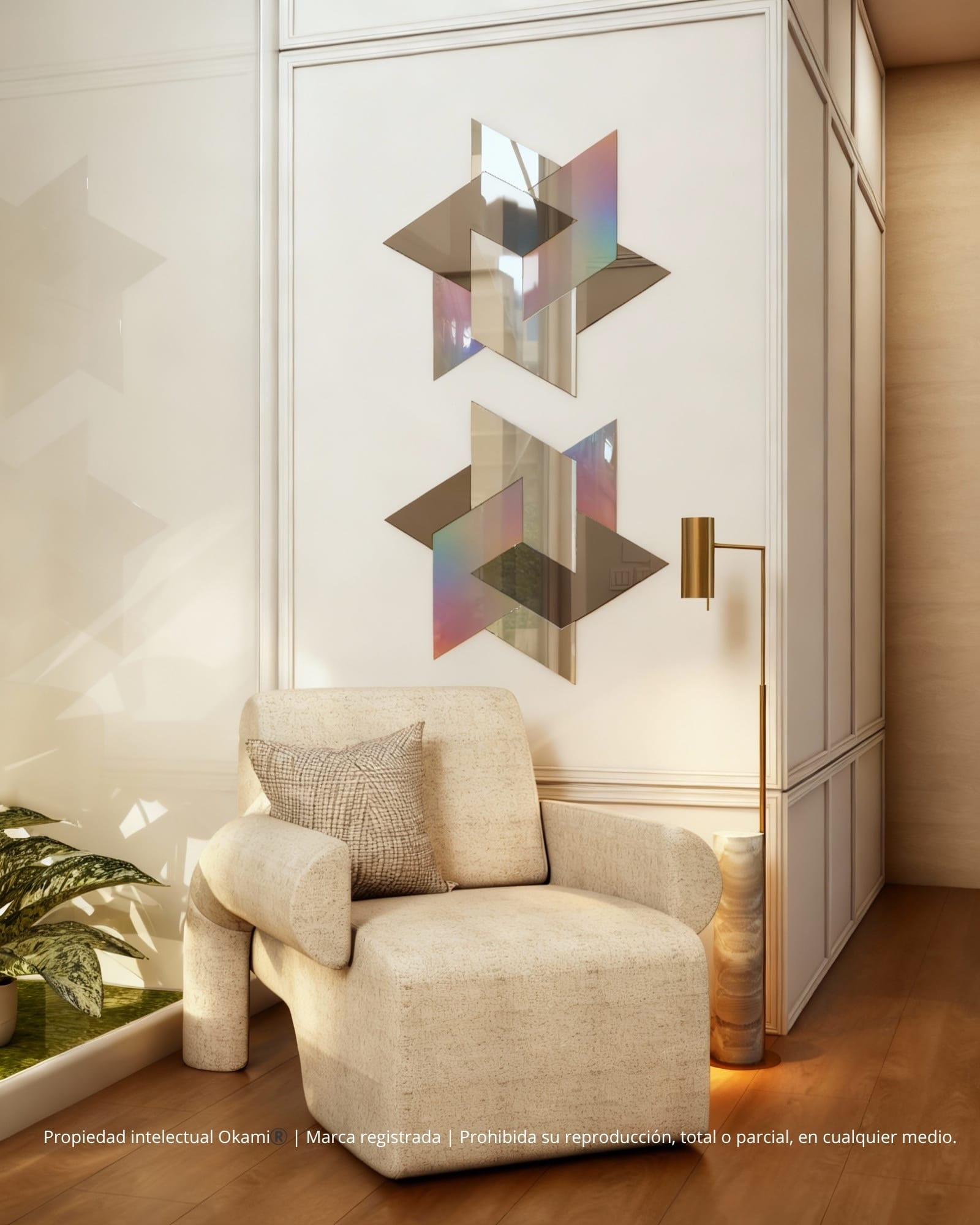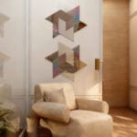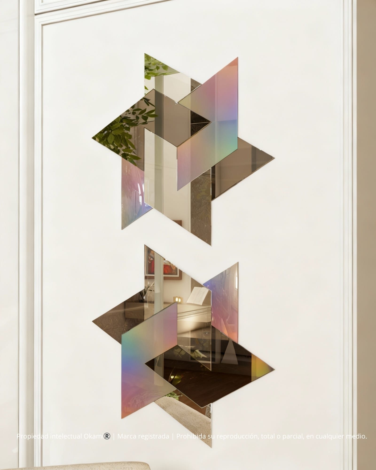Estrella Buena corresponde a una escultura mural tridimensional en forma estelar, compuesta por módulos geométricos ensamblados con precisión milimétrica que conforman una figura hexagonal de gran pureza visual. Su diseño combina la simetría matemática con la capacidad escultórica del espejo, generando un efecto de profundidad y ligereza.