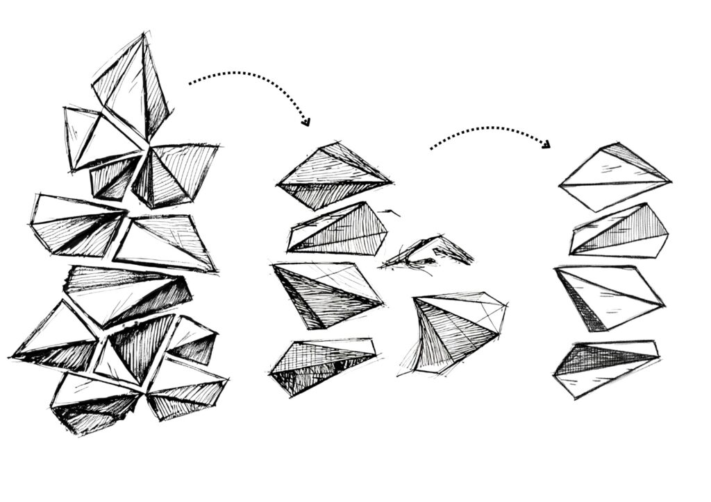 Camino Fractal corresponde a una escultura mural de doble altura, conformada por módulos geométricos triangulares ensamblados en disposición vertical, lo que acentúa la sensación de movimiento ascendente y ligereza. Su diseño escultórico aprovecha la verticalidad de los muros altos, convirtiéndose en un punto focal arquitectónico de gran impacto visual.
