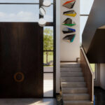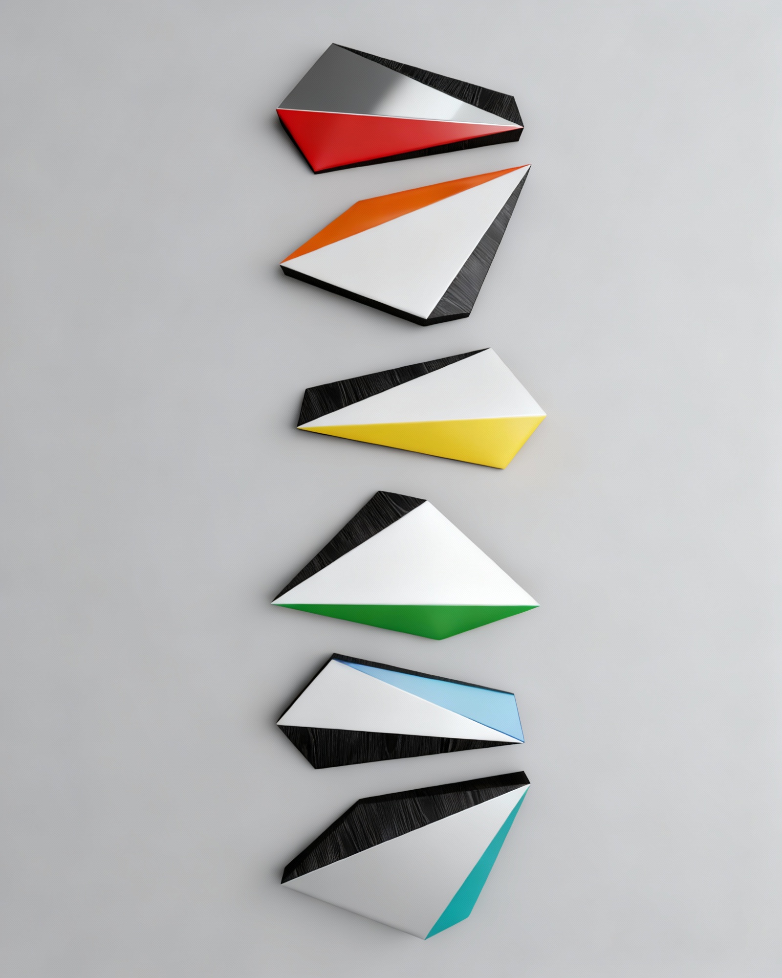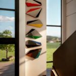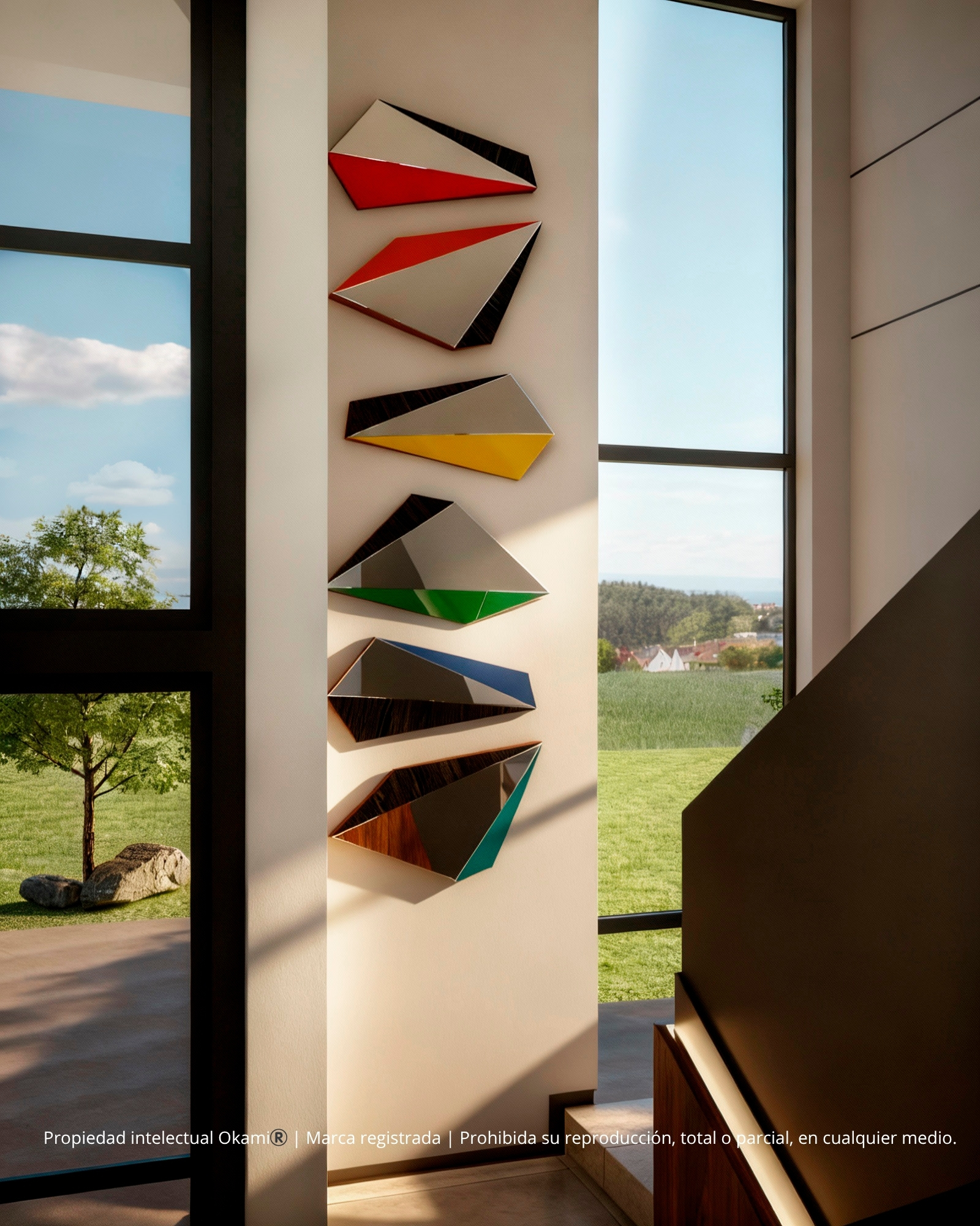 Camino Fractal corresponde a una escultura mural de doble altura, conformada por módulos geométricos triangulares ensamblados en disposición vertical, lo que acentúa la sensación de movimiento ascendente y ligereza. Su diseño escultórico aprovecha la verticalidad de los muros altos, convirtiéndose en un punto focal arquitectónico de gran impacto visual.