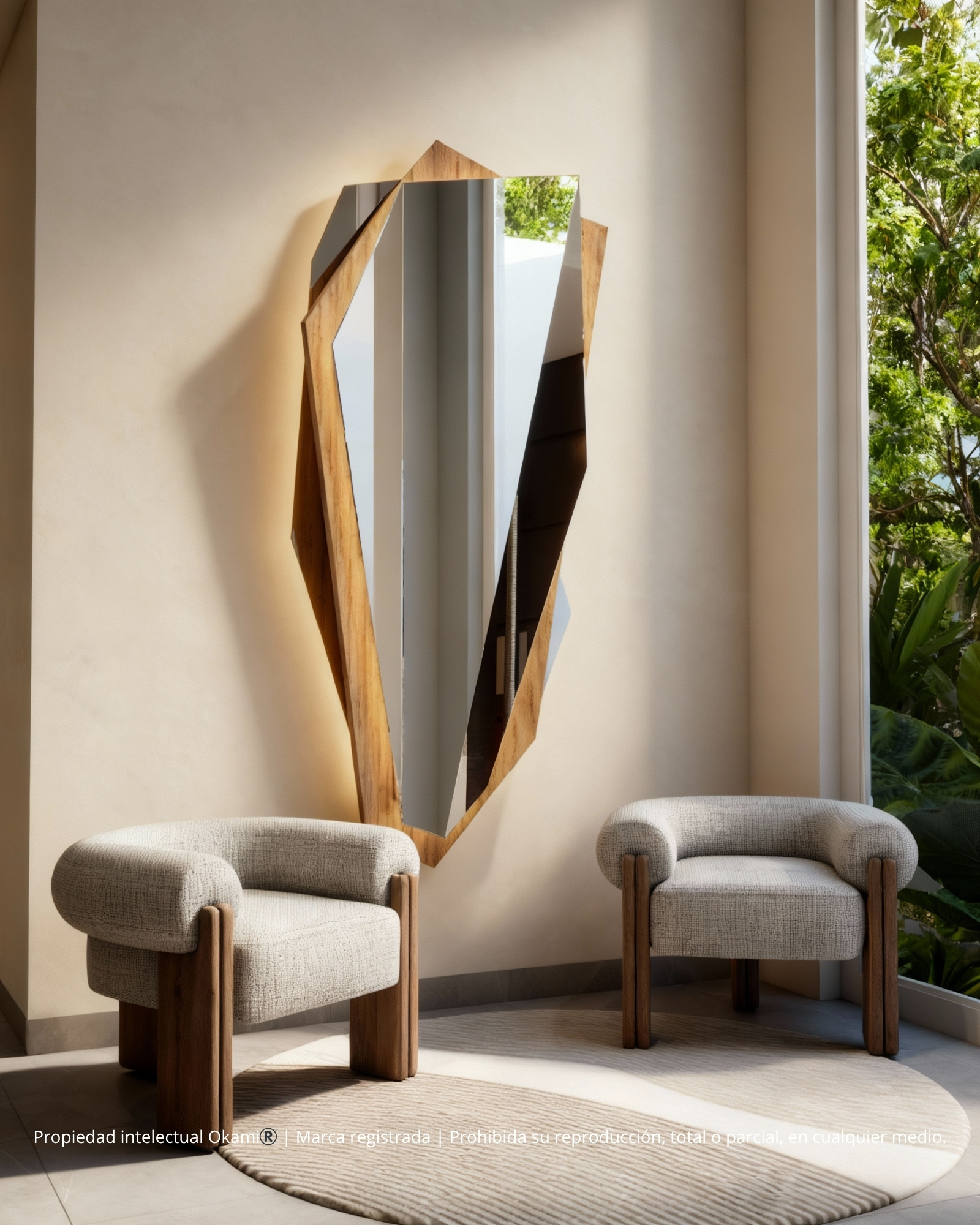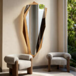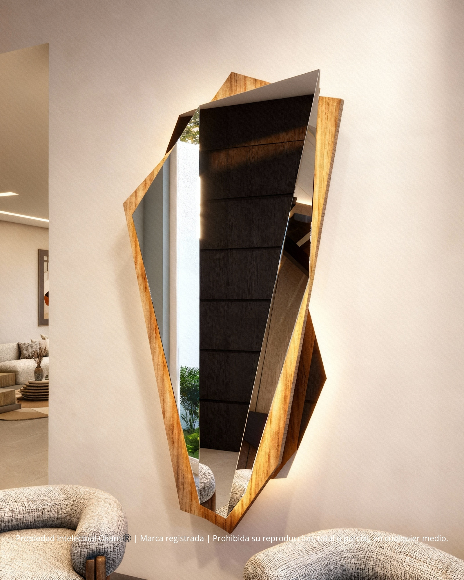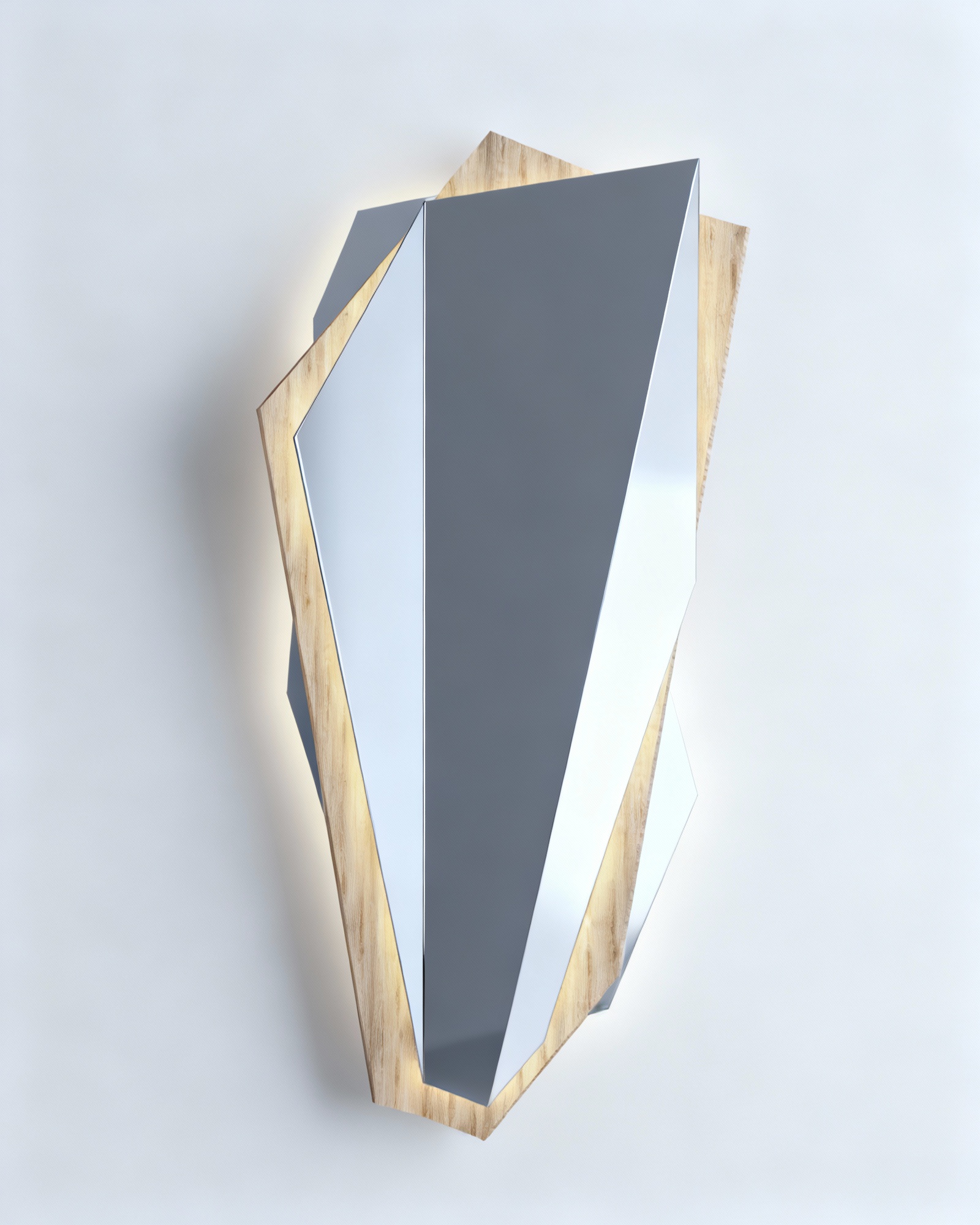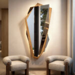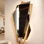Stratto corresponde a una escultura mural facetada de diseño escultórico, compuesta por planos geométricos irregulares ensamblados en una estructura vertical de gran fuerza visual. Su silueta fragmentada genera un contorno dinámico que rompe con la linealidad de los espejos tradicionales, aportando un carácter contemporáneo y exclusivo al espacio.